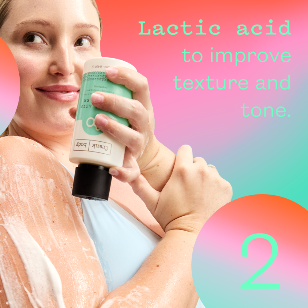 Wash off chicken skin, acne, and toxic exes. I’m a blend of three blemish-fighting acids that tackle the first signs of body breakouts and the marks they leave behind. I break down dead skin, remove impurities and fight inflammation which means I also battle the little bumps that pop up on your arms and legs. A triple threat for clear skin, I’m the most active shower you can have (wink).