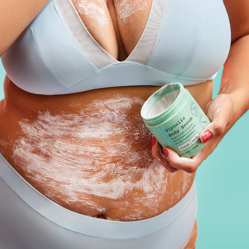 Use my Glycolic Body Scrub in the shower. Scoop out a handful of scrub and massage it into your skin using circular motions. Give extra love to areas that want special attention. Think scars, marks, lumps, and bumps.