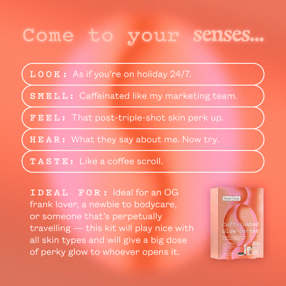 For babes who only resurrect from their pillow by the smell of coffee, I’ve pulled together a glow-stimulating, dull-banishing Santa’s sack of my Original best-scrubbers that’ll leave you smelling and feeling as perky as your iced frappuccino. Buff away the year with the OG scrub that made me famous, moving onto the face, and finally the lips, sealing it all in with my free adored Lip Balm.